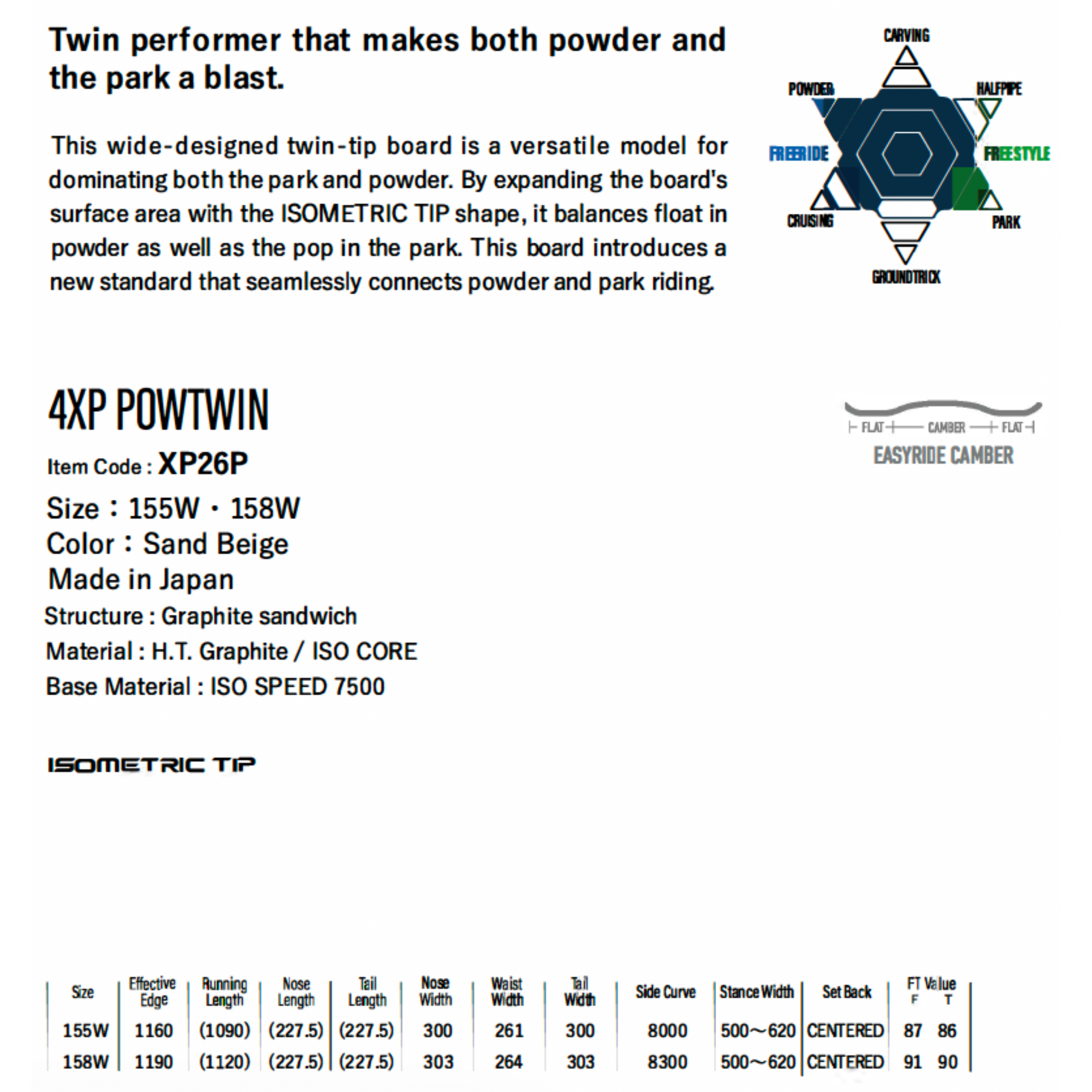 This wide-designed twin-tip board is a versatile model for dominating both the park and powder. By expanding the board's surface area with the ISOMETRIC TIP shape, it balances float in powder as well as the pop in the park. This board introduces a new standard that seamlessly connects powder and park riding.