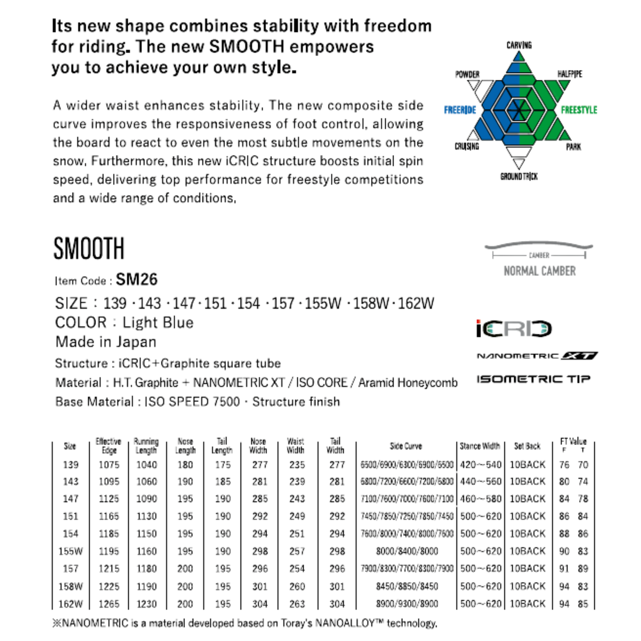 A wider waist enhances stability. The new composite side curve improves the responsiveness of foot control, allowing the board to react to even the most subtle movements on the snow. Furthermore, this new iCRIC structure boosts initial spin speed, delivering top performance for freestyle competitions and a wide range of conditions.